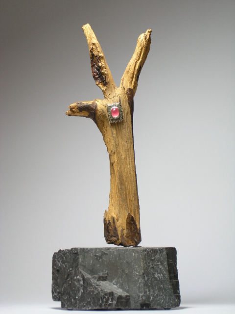 Höhe: 28 cm, Material: Calcit, Holz, Silber, Rhodochrosit